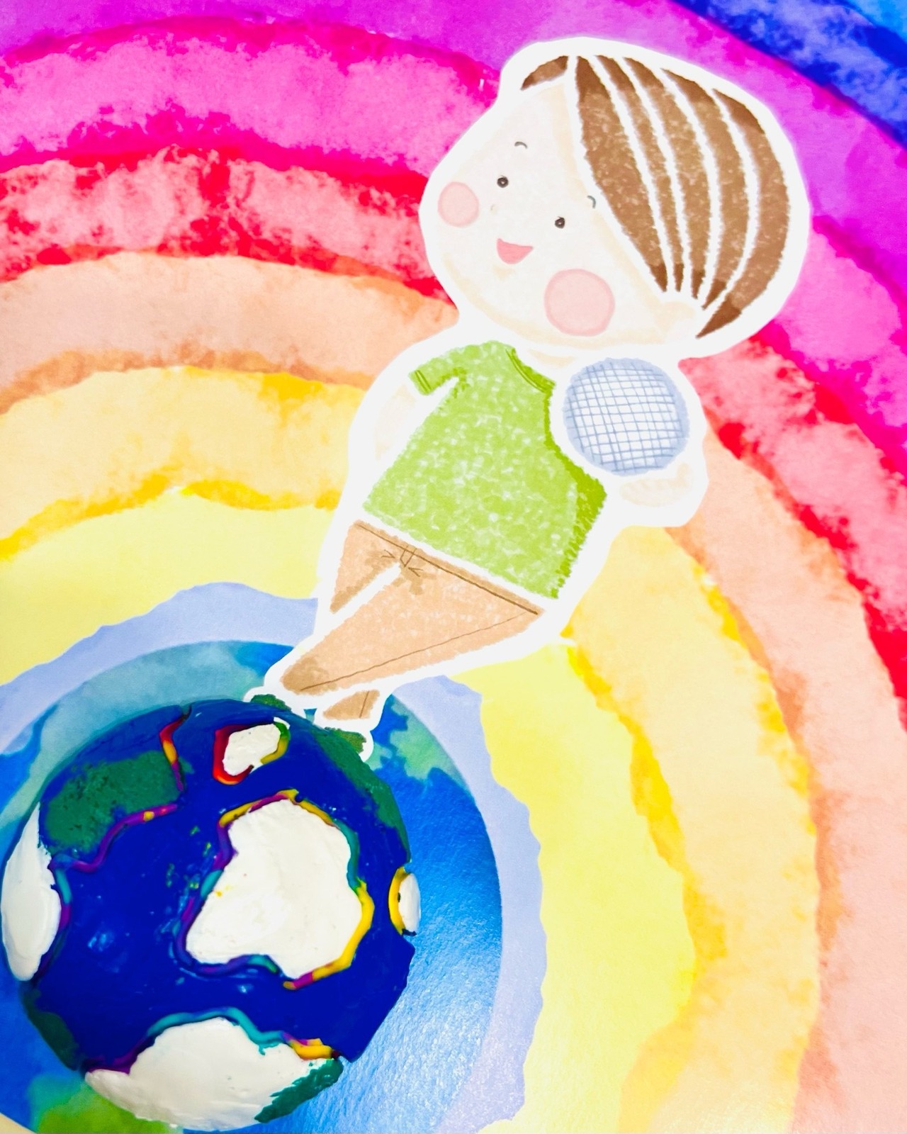 くるくる描くたびに、海の青、山の緑、レインボーカラーが現れ、まるで地球を旅するような楽しい仕掛けになっています。